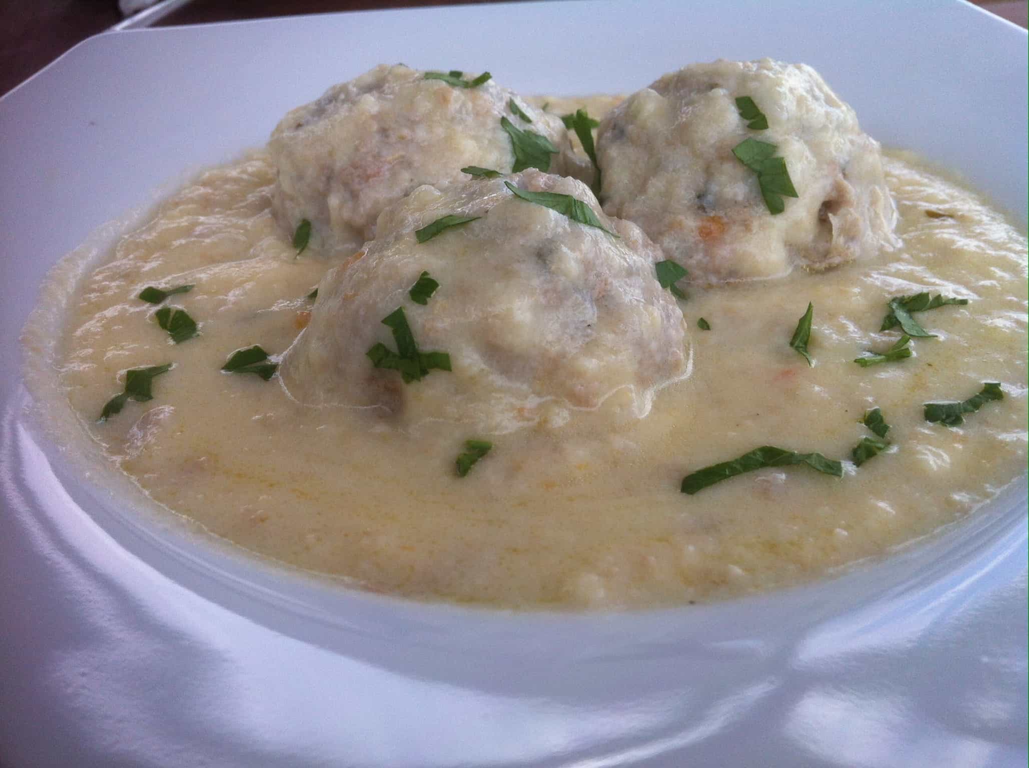 It a Greek meatball (kefte κεφτέ) made of beef and rice or bulgur and cooked in moist heat; it is also a dish of these meatballs in tomato or avgolemono sauce.